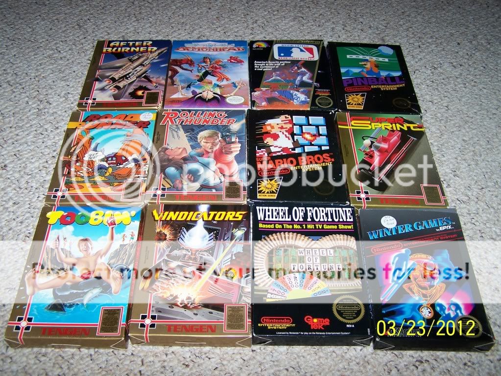 List: *After Burner - $5.00 *Clash At Demonhead - $3.00 *Major League Baseball - $1.00 *Pinball (Nice Condition Black Box Game) - $5.00 *Road Runner - $8.00 *Rolling Thunder - $2.00 *Super Mario Bros. 1 - A WHOPPING - $2.00!!!!! CIB *Super Sprint - $6.00 *Toobin' - $8.00 (We will be selling just a cart of this game) *Vindicators - $2.00 *Wheel of Fortune - $6.00 *Winter Games - $3.00