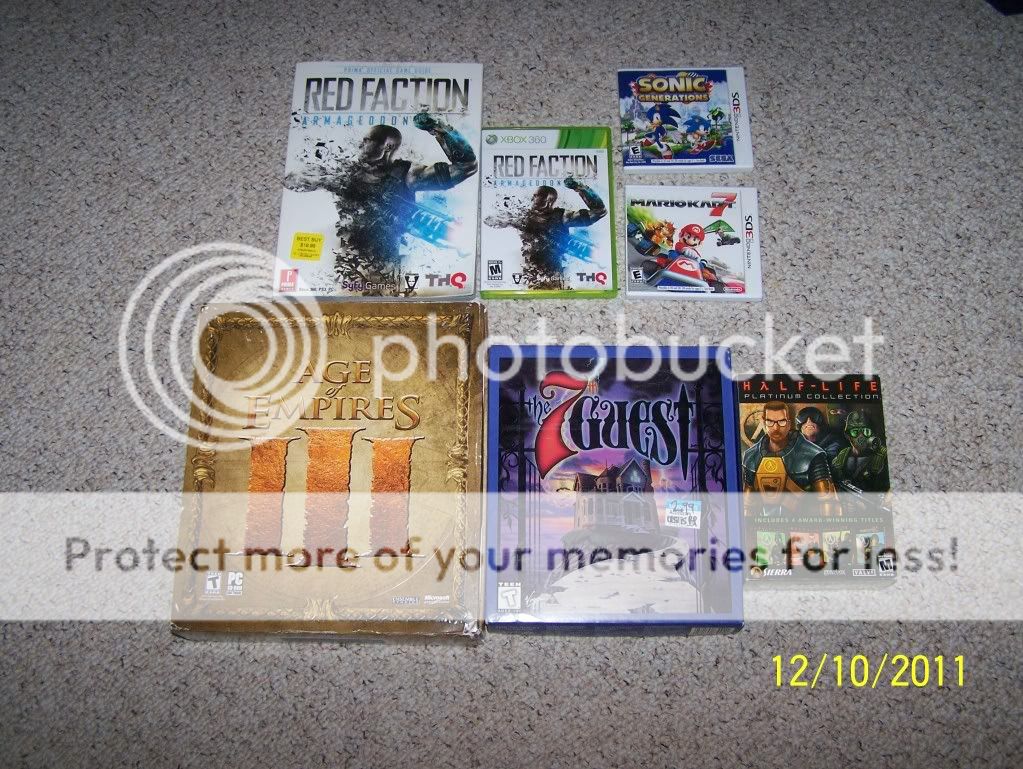 Hey everyone! I know two blogs in two days! Well my brother did a little shopping yesterday and we did a little shopping tonight. SO I decided I needed to share in all the goodies we got. Yesterday my brother went to Best Buy and Goodwill Bytes in Omaha. At Best Buy he bought Mario Kart 7 and Red Faction Armageddon Guide & Game. At Goodwill he purchased Age of Empires 3 Collector's Edition ($9.99), Half-Life Platinum Collection FIRST RELEASE ($7.99), and 7th Quest ($2.99) all PC Games. Then Today we went to CD Tradepost in Council Bluffs they had a ton of stuff but we didn't have the money to get the two most expensive things Earthbound for $153.00 and Suikoden II for $100.00 as much as I wanted them we couldn't get them. SO this is what we got: