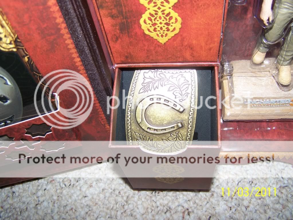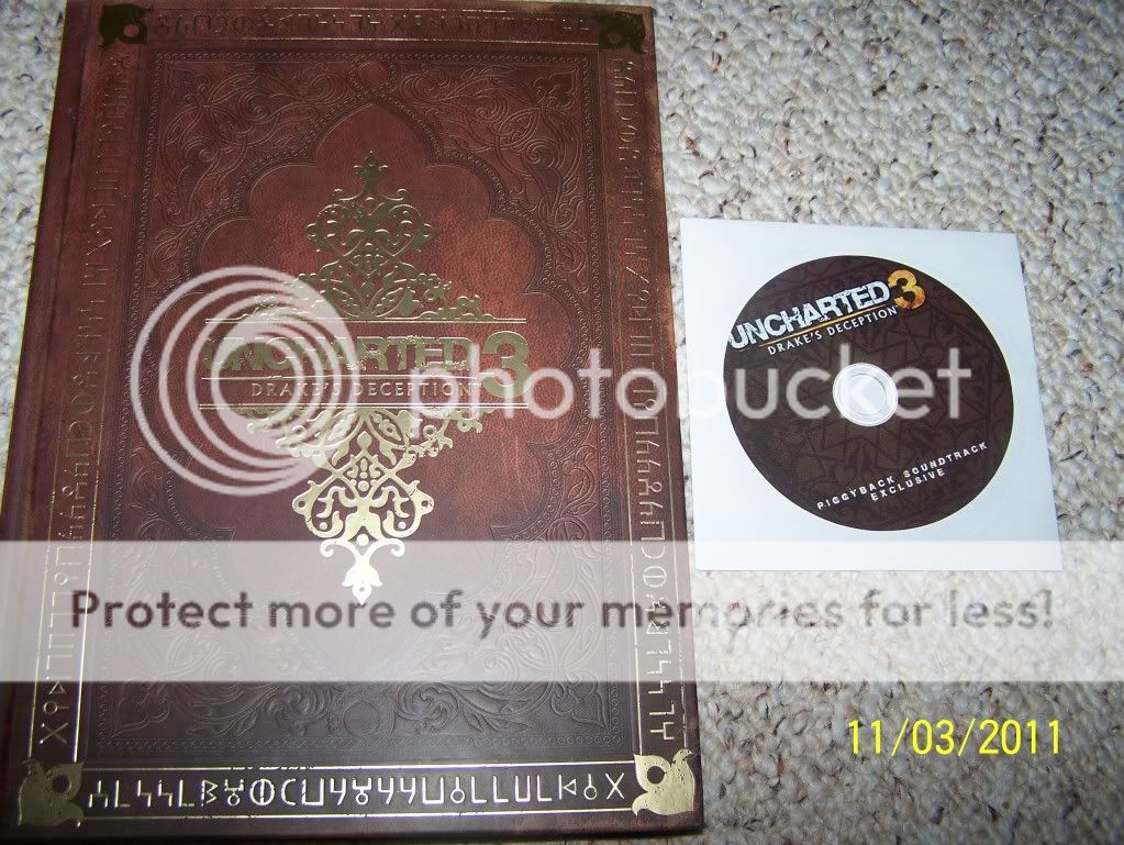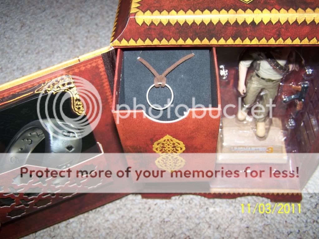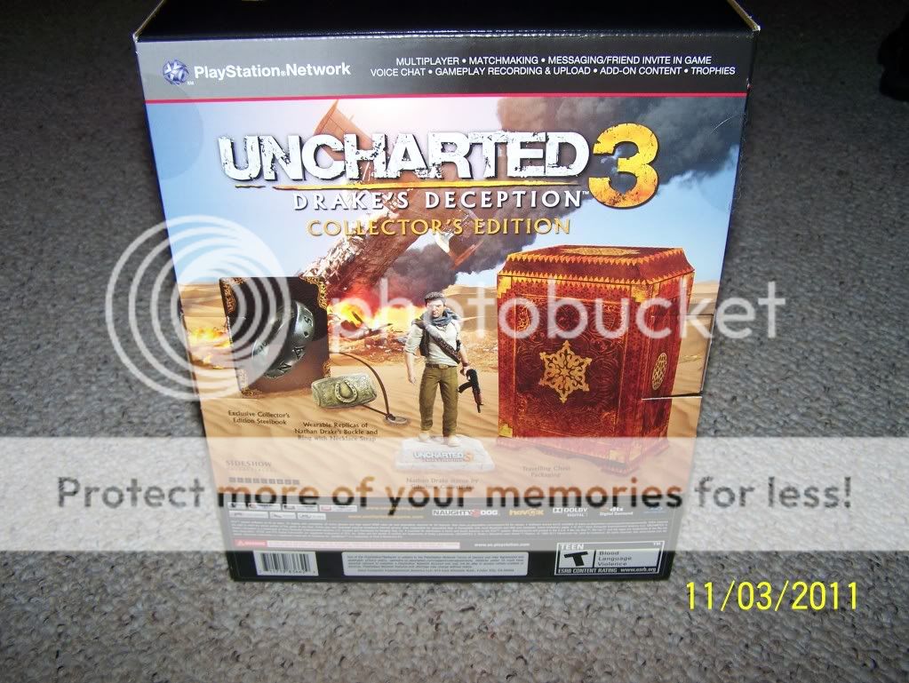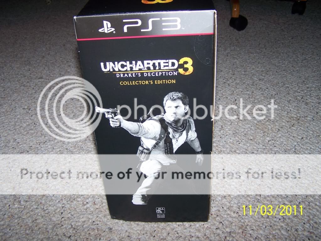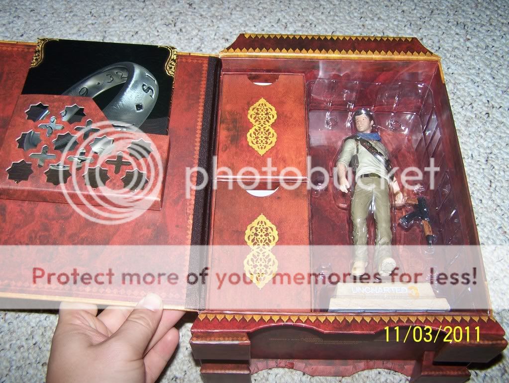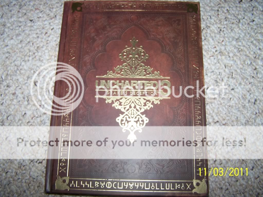 Hey everyone! I picked up my copy of Uncharted 3: Drake's Deception Collector's Edition on Tuesday at Game Stop. I pre-ordered and paid the game off a while back and couldn't wait to get it. I think the Uncharted Series is one of the best game series out there there, (well besides Halo). I know there are some great series releases this month such as Elder Scrolls, Call of Duty: Modern Warfare 3, Halo Anniversary Edition, and last month was Battlefield 3. But this one is a great release. The Collector's Edition is pretty cool the game comes in a steel book case which is in a wardrobe case. In the wardrobe case is two drawers the top drawer holds a necklace with the ring from the first game on it. The second drawer holds the belt buckle with a horseshoe that Drake wears in the games. I for one will never wear either because it de-values the game with the items being used. The steel book case is pretty cool because it has a great artwork on it the game is inside the wardrobe hanging on the door. The final item in the wardrobe is the statue. The statue is pretty detailed, I didn't take it out of the plastic because I want to keep it brand new, it also comes with an AK-47 a basic gun in the game that Drake likes to use. The game play is pretty much the same as the rest but it is exciting and can't wait to begin and finish the game (I have to finish the second game first). Also my brother purchased the strategy guide for the game, the Collector's Edition guide to be exact. The guide is a hardcover book with the Soundtrack included for the game. Hope you all enjoyed the unveiling and here are some pictures to go with it.