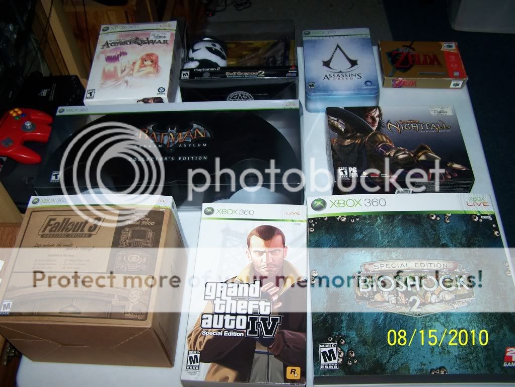 (FROM LEFT TO RIGHT) 1. Records of Agarest War - The Really Naughty Limited Edition (NEW/SEALED) 2. Devil Summoner 2: Raidou Kuzunoha vs. King Abaddon - Raiho Special Edition (NEW/SEALED) 3. Assasin's Creed Limited Edition (Xbox 360) 4. Legend of Zelda: Orcarina of Time Collector's Edition (N64) 5. Batman: Arkham Asylum: Collector's Edition (Xbox360) 6. Guild Wars: Nightfall: Collector's Edition (PC) 7. Fallout 3: AMAZON COLLECTOR'S EDITION (ONLY BOUGHT ON AMAZON) (NEW/SEALED) 8. Grand Theft Auto IV: Special Edition (Xbox 360) 9. Bioshock 2: Special Edition