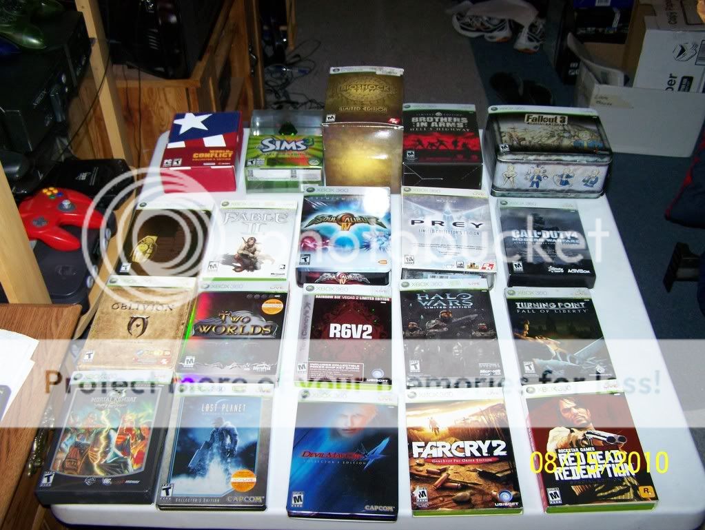 1. World In Conflict - Collector's Edition (PC) 2. Sims 3 - Collector's Edition (PC) 3. Bioshock: Limited Edition (PC) 4. Brother's In Arms: Hell's Highway - Limited Edition (360) 5. Fallout 3: Lunch Box Special Edition (NOT THE AMAZON EDITION) (360) 6. Battlefield: Bad Compnay - Gold Edition (360) 7. Fable 2 - Limited Collector's Edition (360) 8. Soul Calibur IV - Limited Edition (360) 9. Prey - Limited Collector's Edition (360) 10. Call of Duty 4: Modern Warfare - Limited Collector's Edition (360) 11. Elder Scrolls IV: Oblivion - Collector's Edition (360) 12. Two Worlds - Collector's Edition 13. Rainbow Six Vegas 2 - Limited Edition 14. Halo Wars - Limited Edition 15. Turning Point: Fall of Liberty - Limited Edition 16. Mortal Kombat vs. DC Universe - Collector's Edition 17. Lost Planet: Extreme Condition - Collector's Edition 18. Devil May Cry 4 - Collector's Edition 19. Farcry 2 - Game Stop Pre-Order Edition 20. Red Dead: Redemption - Special Editoin