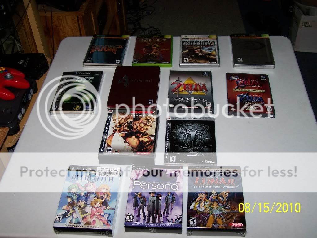 1. Doom 3 - Collector's Edition (Xbox) 2. Jade Empire - Limited Edition (Xbox) 3. Call of Duty 2: Big Red One - Special Edition (Xbox) 4. Halo 2: Limited Collector's Edition 5. Splinter Cell: Chaos Theory - Limited Collector's Edition (GameCube) 6. Resident Evil 4 - Game Stop Exclusive Edition 7. Legend of Zelda: Collector's Edition - (Game Cube) 8. Legend of Zelda: Two-Game Bonus Disc - (Game Cube) 9. Metal Gear Solid 4 - Limited Edition (PS3) 10. Spider-Man 3 - Collector's Edition (PS3) 11. Mimana Iyar Chronicles - Special Edition (PSP) 12. Persona - Special Edition (PSP) 13. Lunar: Silver Star Harmony - Premium Edition (PSP)