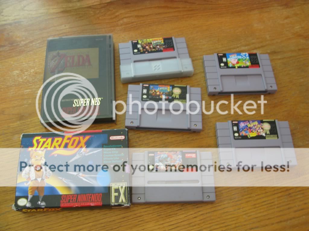 First off is the SNES finds. Starfox CIB, Zelda complete except box, DKC 2 & 3, SF II, Kirby's Avalanche, and Dr. Mario + Tetris. Nothing fantastic, and I let my buddy have the loose FFII I found since I have it CIB already.