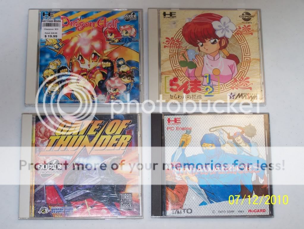 Description: Picture 6 - IS of the Japanese PC Engine Games, TWO of which are PC-Engine Super-CD (aka in USA would be the Turbo Duo). The Third game is a cartridge game for the PC Engine. Game Titles CD: A Ranma 1/2 game and the other is titled Dragon Half. The Cartridge is Ninja Warriors.