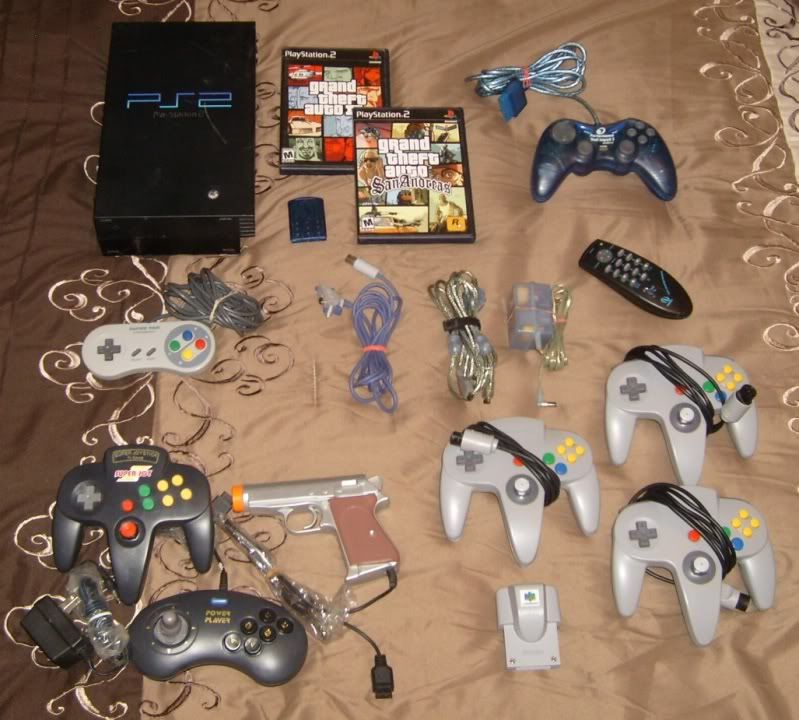 The PS2 supposedly doesn't work, but haven't tested. The game controllers and gun at lower left are some really cheesy plug-and-play. Don't have the receiver for the DVD remote. The GTA's are FS/FT.