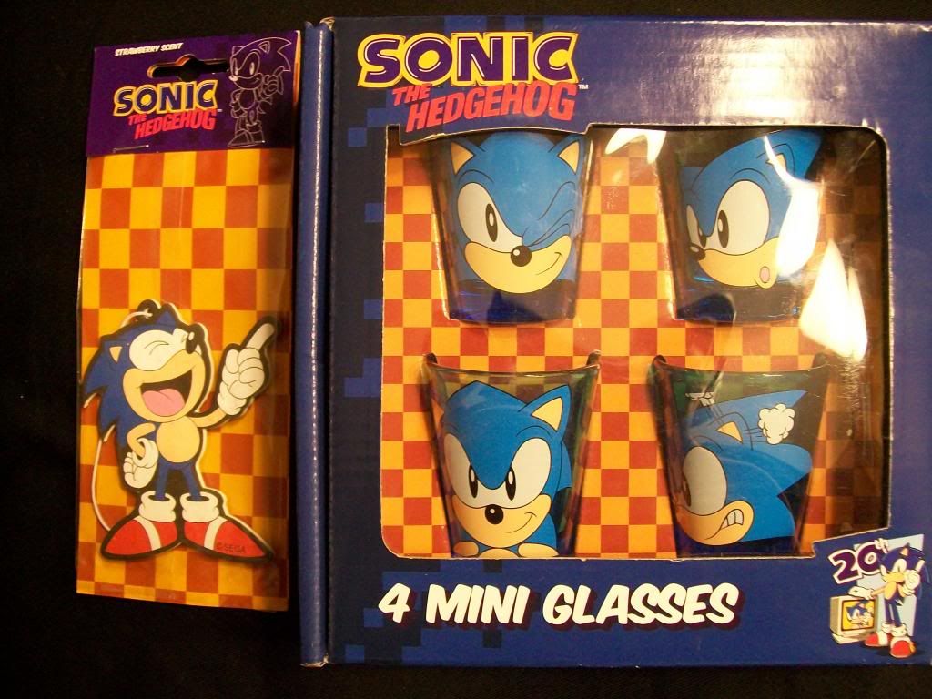 Also got me a set of four Sonic the Hedgehog shotglasses and a Sonic car air freshener at Spencer's in my local mall.