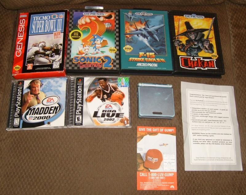 These were all freebies. CIB Tecmo SBIII, Sonic 2, Chakan, F-15 no manual, Madden 2000, NBA Live 2002 (FS/FT), a working GBA SP AGS-101 (too scratched up to sell). I found an insert for a Bubba Gump promo cap and a congrats for buying a Genesis SG Pro Pad in the cases.