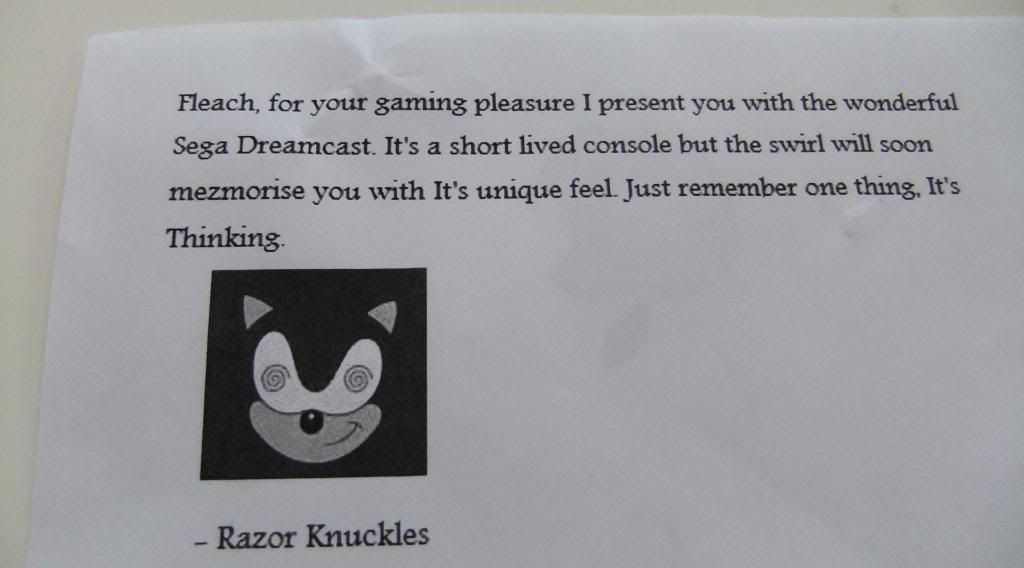 This came from my good friend Razor. He knew that I've really wanted a Dreamcast for a while and remembered that I got screwed over last year trying to buy. Being the RFGentleman he is he sent me a snazzy Dreamcast with a goodies. Thanks buddy!
