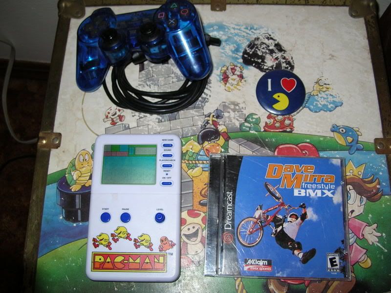 I think garage sale/flea market season is coming to an end for this year.  This is all I found this weekend.  The PS2 controller was $1 The "I Heart Pac-Man" pin was $0.25 The Pac-Man handheld was $0.50 (I don't know what's with all the Pac-Man stuff I've been finding lately, I don't really even like the game that much  ) The Dave Mirra game was also $0.50 On a side not, I did find something great while looking through trash on Friday. About 50 pounds of copper wire. At about $2.50 per pound it'll be an easy $100, after I strip off the insulation.