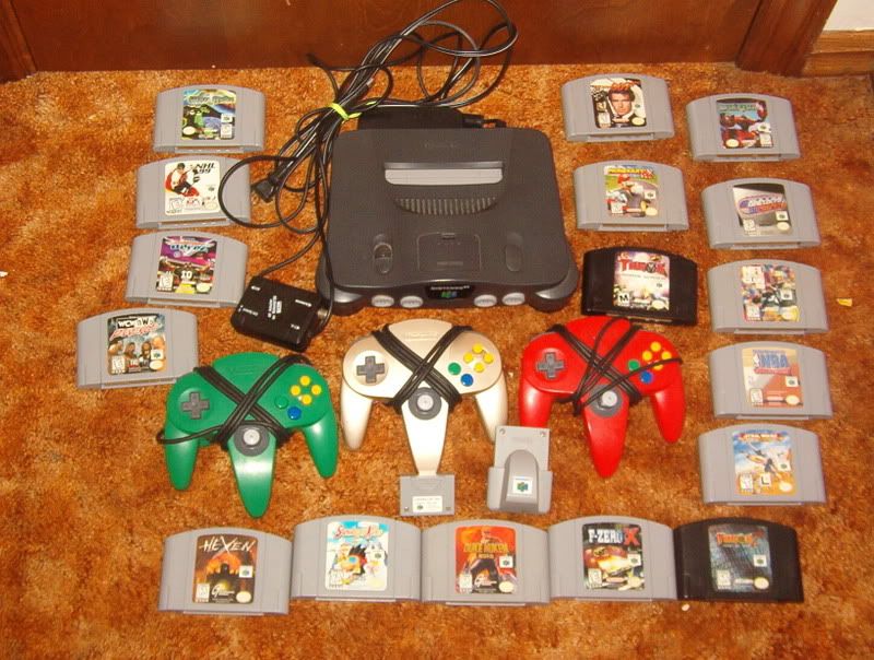 My dad picked this stuff up for me today at a garage sale.  N64 system with hookups Red controller green controller Gold controller (What was the story behind these again? Weren't they from a Nintendo Power contest?) Controller Pak Rumble Pak Turok: Rage Wars Mario Kart 64 Goldeneye 007 Starfox 64 Wayne Gretzky's 3D Hockey NFL Quarterback club 99 Kobe Bryant in NBA Courtside Star Wars: Rogue Squadron Turok 2 F-Zero X Duke Nukem 64 WCW/NWO Revenge NFL Blitz Snowboard Kids War Gods Hexen NHL 99